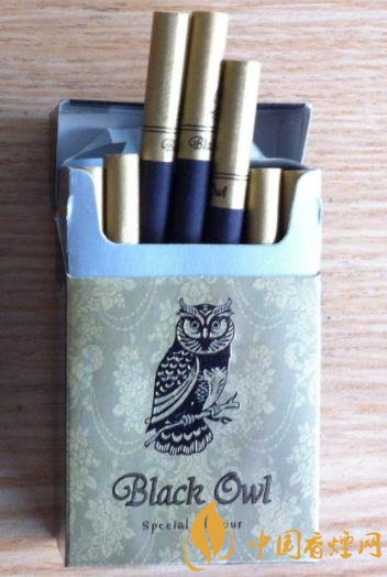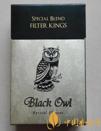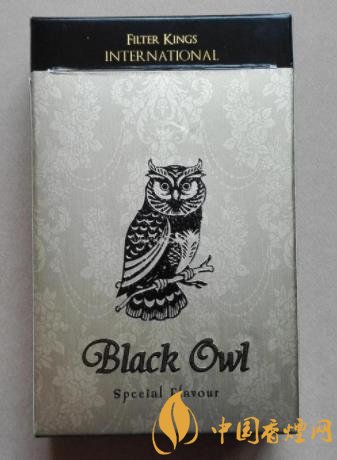 此煙的外包裝還不錯(cuò),正反面都是貓頭鷹的頭像,給人很清爽的感覺(jué),盒蓋和四周都是黑色的,正反面主體是淡金色的,還有暗花的花紋。正面的主體圖案就是一只站在樹(shù)枝上的貓頭鷹還是凸版印刷的,下方就是品名BLACK OWL黑貓頭鷹,品名下還有Special Flavour特殊香味,盒蓋上用燙金字體印著FILTER KINGS過(guò)濾嘴式,上方還有SPECIAL BLEND特殊混合型。