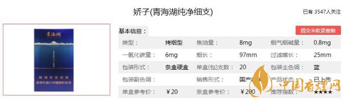以上便是香煙網(wǎng)小編為大家介紹的關(guān)于嬌子青海湖純凈多少錢一包 青海湖純凈價(jià)格及圖片介紹的相關(guān)信息,看完之后大家是不是對(duì)于嬌子(青海湖純凈)這款香煙的相關(guān)信息更加了解呢。大家還想查詢更多的相關(guān)內(nèi)容歡迎點(diǎn)擊:嬌子青海湖細(xì)支香煙多少錢一包 嬌子青海湖細(xì)支參數(shù)