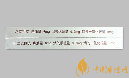 | 類型 :烤煙型 | 焦油量 :9mg | 煙氣煙堿量 :0.9mg | 一氧化碳量 :9mg |