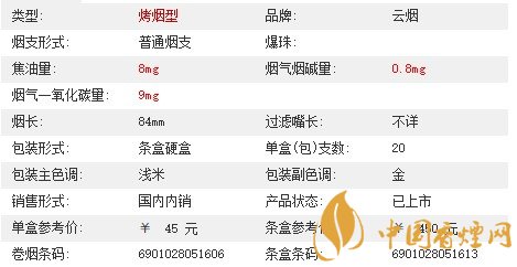 | 類型 :烤煙型 | 焦油量 :8mg | 煙氣煙堿量 :0.8mg | 一氧化碳量 :9mg |