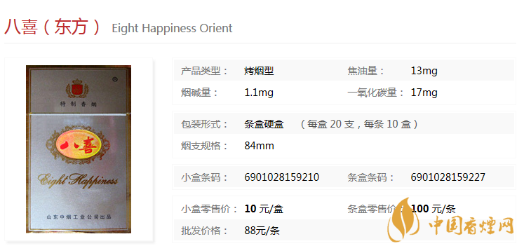 “八喜”煙是山東青州卷煙廠93年推出了“南有紅塔山,北有八喜煙”的促銷宣傳口號(hào),推出了“八喜”香煙。1996年榮獲全國(guó)名優(yōu)卷煙"一等品"殊榮,1999年被評(píng)為山東八大名牌之一。