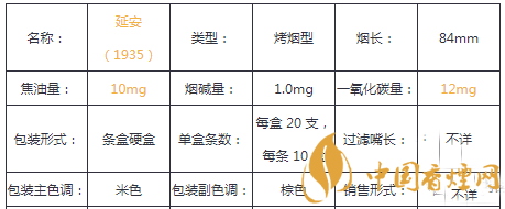 在了解了延安香煙最貴的多少錢(qián)之后,為了大家能更詳見(jiàn)的了解此煙,小編特意將延安1935香煙的核心參數(shù)進(jìn)行了整理,以便于對(duì)它進(jìn)行更深入的了解。