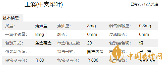 | 類型 :烤煙型 | 焦油量 :8mg | 煙氣煙堿量 :0.8mg | 一氧化碳量 :8mg |