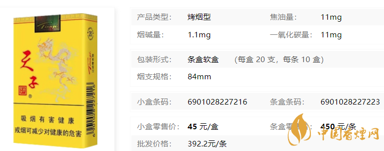 通過上面的介紹,2020天子(軟黃)香煙多少錢一包以及最新天子(軟黃)香煙價格表圖大家都了解了,它定位高端,吸味好,持灰更是讓人刮目相看,超值的一款香煙。了解更多香煙相關咨詢,請關注香煙網(wǎng)。