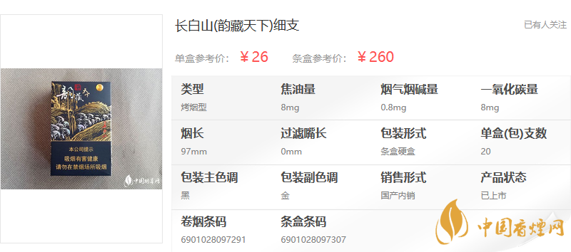 以上就是小編收集到的長白山細(xì)支香煙多少錢一盒,長白山細(xì)支香煙價格表圖大全的相關(guān)內(nèi)容,以上數(shù)據(jù)均來源于網(wǎng)絡(luò),僅供參考,小編溫馨提示,為了您和家人的健康,請您盡量少吸煙,更多相關(guān)信息請關(guān)注香煙網(wǎng)。