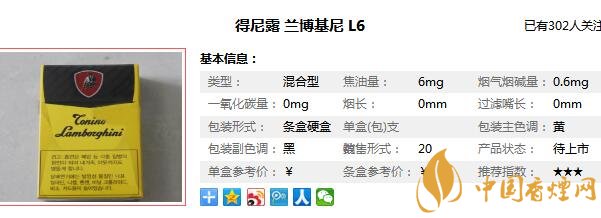 | 類(lèi)型 :混合型 | 焦油量 :6mg | 煙氣煙堿量 :1mg | 一氧化碳量 :12mg |