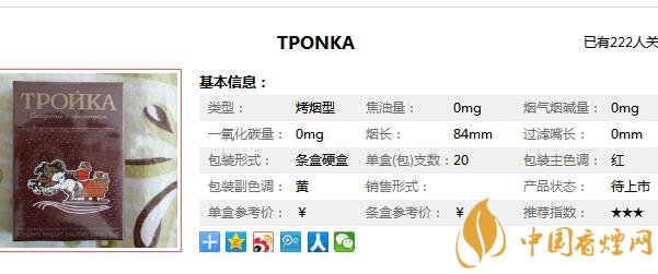 TPONKA(三套車)香煙是俄羅斯的香煙品牌,由于俄羅斯香煙都存在一個(gè)特點(diǎn),也許是戰(zhàn)斗名族特有的吧,他們的香煙都是非常的烈的,那么在了解俄羅斯TPONKA香煙價(jià)格表之前,先來看一看tponka香煙多少錢一包,這款香煙的參考價(jià)為15元/包。