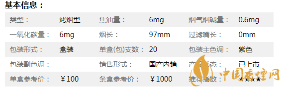 | 類型 :烤煙型 | 焦油量 :11mg | 煙氣煙堿量 :1.1mg | 一氧化碳量 :13mg |