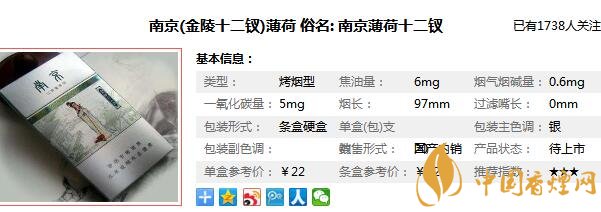 南京卷煙是江蘇中煙南京卷煙廠的代表品牌,而南京薄荷味香煙就是南京(金陵十二釵)薄荷,“金陵十二釵”香煙由南京卷煙廠在1988年出品,是非常少見的12包裝成套系列的產品,在煙標收藏界,這套融詩、書、畫于一體的“金陵十二釵”被視為設計最精美的煙標,那么在對南京薄荷味香煙價格圖片分析之前,先來看看這款南京薄荷味香煙多少錢,它的售價為22元/包。
