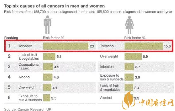 我國煙草生產(chǎn)量和消費(fèi)量穩(wěn)居世界第一,并擁有3億以上的煙民。雖然“吸煙有害健康”的標(biāo)語早已經(jīng)出現(xiàn)在大街小巷,但很多朋友只是莞爾一笑。其實(shí)這口號(hào)并非危言聳聽,煙草使用占所有死亡危險(xiǎn)因素的第2位。男性32.7%的癌癥死亡歸因于吸煙,遠(yuǎn)高于女性的5.0%。
