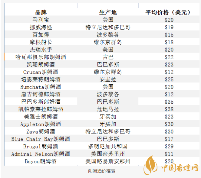 由于朗姆酒種類和品牌繁多,以下列出了20個(gè)朗姆酒品牌的平均價(jià)格: