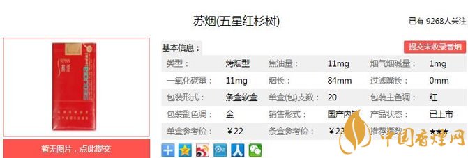 蘇煙五星紅杉樹(shù)產(chǎn)品包裝大膽采用全版電化鋁印刷技術(shù)及橫向的純字體裝飾,外觀(guān)設(shè)計(jì)簡(jiǎn)約大方、時(shí)代感強(qiáng),喜慶、大方,與“蘇煙”系列產(chǎn)品風(fēng)格一脈相。經(jīng)香煙網(wǎng)小編市場(chǎng)調(diào)查蘇煙五星紅杉樹(shù)售價(jià)為22元/包。