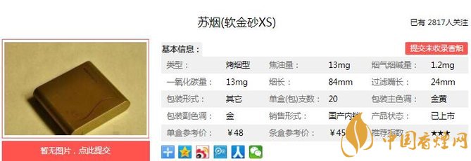 蘇煙軟金砂XS其實(shí)塑盒內(nèi)放置的煙支就是蘇煙軟金砂,只是換了個(gè)精致的包裝而已。目前已經(jīng)停產(chǎn),市面上比較少見(jiàn),但卻時(shí)不時(shí)能遇到閑置的,其中以帝都居多,包裝十分有檔次。經(jīng)香煙網(wǎng)小編市場(chǎng)調(diào)查蘇煙軟金砂XS售價(jià)為48元/包。