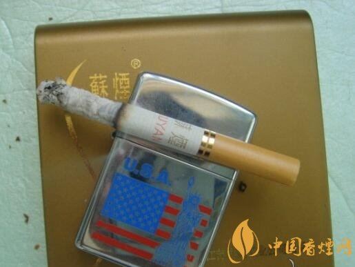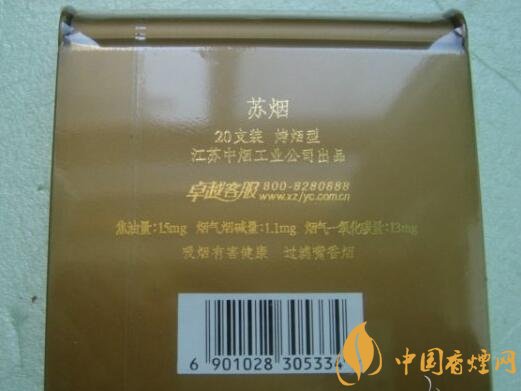 暗金色塑盒包裝,主體為方形,上下兩側(cè)作弧形處理,給人以輕巧圓潤(rùn)之感。正面左側(cè)一道極似女人身體曲線的“S”形劃過(guò),旁邊有繁寫的“蘇煙”二字,右下方是“江蘇中煙工業(yè)公司出品”,設(shè)計(jì)簡(jiǎn)約,表意婉約。背面標(biāo)有商品的基本信息(包括三項(xiàng)理化指標(biāo)、條形碼等)和警示語(yǔ)。其余四面皆無(wú)文字或圖案。