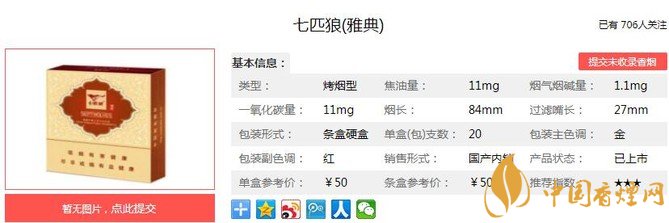 七匹狼雅典煙支長84mm,過濾嘴長27mm,嗅香是淡淡的煙草清香,輕捏煙支飽滿有彈性,可見填充較為嚴(yán)實,煙葉色澤油亮,梗絲碎葉極少,品質(zhì)不錯。下面我們一起來看七匹狼雅典的參數(shù)信息:焦油量:11mg 煙堿量:1.1mg 一氧化碳量:11mg