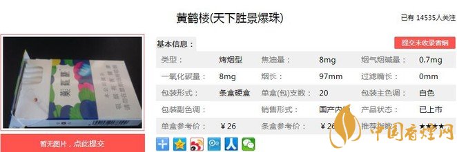 黃鶴樓天下勝景爆珠煙支長97mm,運用中國獨有的木桶薰蒸技術,形成了煙草本香與生姜植物的有機結合。下面我們一起來看黃鶴樓天下勝景爆珠的參數信息:焦油量:8mg 煙堿量:0.7mg 一氧化碳量:8mg
