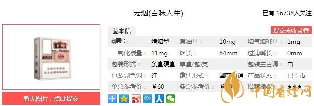 云煙百味人生優(yōu)選世界香料,取典型天然香韻,提取爆珠,賦予獨特香味風(fēng)格吸味,與本香完美融合。選擇捏爆爆珠,感受爆珠香氣與煙草本香完美融合帶來的獨特的風(fēng)格吸味,煙味醇厚,豐富甜潤,領(lǐng)尚五味。經(jīng)香煙網(wǎng)小編市場調(diào)查云煙百味人生售價為60元/包。
