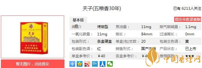 天子五糧香30年包裝盒正中間是稻谷、小麥、玉米、高粱、大豆的圖案,也就是所謂的內(nèi)含五糧香珠的“五糧”,香煙吸味上純粹五糧香,口感甘甜、味道醇厚,深受廣大煙民的喜歡。經(jīng)香煙網(wǎng)小編市場調(diào)查天子五糧香30年售價(jià)為40元/包。