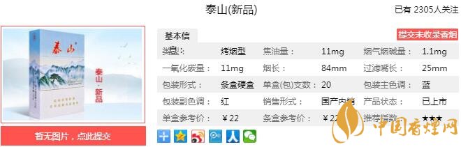 泰山(新品)卷煙精選優(yōu)質(zhì)進(jìn)口煙葉,采用純天然香精香料,香氣清雅濃馥、豐滿、諧調(diào)、吸味純正、口感細(xì)膩、余味純凈舒適,“清新自然、至尊泰山”是卷煙中的高檔精品。經(jīng)香煙網(wǎng)小編市場(chǎng)調(diào)查泰山新品售價(jià)為22元/包。