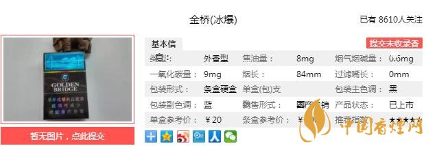 金橋冰爆煙支長84mm,過濾嘴長27mm,過濾嘴上有三排降焦孔,細看煙支切工整齊,煙絲色澤鮮亮。下面我們一起來看金橋冰爆的參數(shù)信息:焦油量:8mg 煙堿量:0.6mg 一氧化碳量:9mg