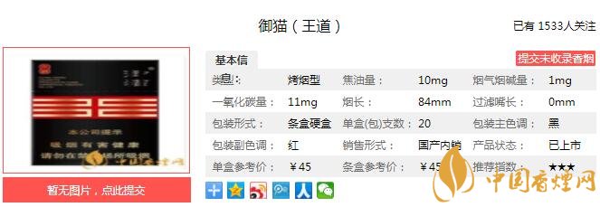 成熟、渾厚、自然的煙草本香結(jié)合甜香韻、果香韻、花香韻和酒香韻,協(xié)調(diào)統(tǒng)一,自然天成。煙香成熟、優(yōu)雅、厚實(shí)、純凈、細(xì)膩、豐富;吃味飽滿(mǎn)、純凈、自然;回味津潤(rùn)、回甜、舒適、干凈。經(jīng)香煙網(wǎng)小編市場(chǎng)調(diào)查御貓王道售價(jià)為45元/包。