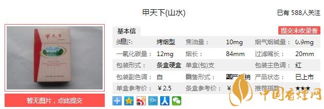 以上便是由香煙網(wǎng)小編為大家介紹的關(guān)于甲天下山水香煙怎么樣 甲天下山水價格及口感介紹的相關(guān)信息,想要了解更多有關(guān)內(nèi)容請點擊:黃金葉茗仕之風(fēng)口感分析 黃金葉茗仕之風(fēng)價格及參數(shù)介紹