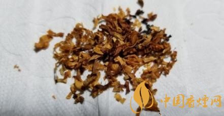 煙絲以明黃為主,輔以少量的棕黃色煙絲,顯然是不同兩種不同品級(jí)的原片切絲混合而來,間雜有切得較細(xì)、揉捻的比較柔軟的煙梗。配方調(diào)和與現(xiàn)款零售版基本一致。
