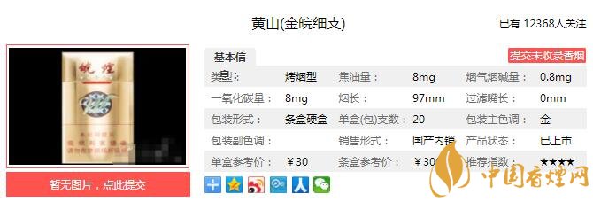 黃山金皖細(xì)支煙支長97mm,過濾嘴長37mm,定位在細(xì)支煙品類。在煙絲生產(chǎn)中,運(yùn)用國際一流的德國豪倪制絲生產(chǎn)線,歷經(jīng)“潤葉、切片、烘絲、摻配、加香”五大修煉,采用先進(jìn)的橡木桶醇化技術(shù)進(jìn)行醇化,生產(chǎn)出的煙絲品質(zhì)優(yōu)良,筑牢了原料保障。下面我們一起來看黃山金皖細(xì)支的參數(shù)信息:焦油量:8mg 煙堿量:0.8mg 一氧化碳量:8mg