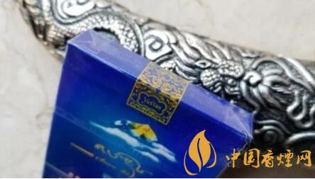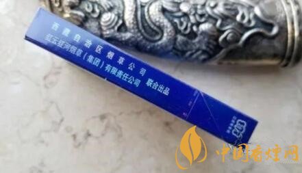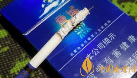 煙盒正反版面一樣,上蓋位置有雪峰日照金山,彌漫的云霧拱衛(wèi)金頂。只是細支的這個圖片質(zhì)量不太理想。煙盒的中部是金色藏文書寫風(fēng)格的“雪域”字樣。居中,有藍色的蓮花座圖案。下有銀色小字——西藏自治區(qū)煙草公司總經(jīng)銷。