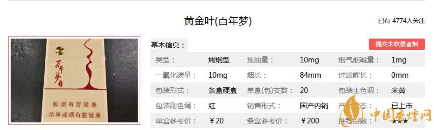 百年夢(mèng)香煙好抽嗎?百年夢(mèng)香煙價(jià)格是多少?黃金葉(百年夢(mèng))煙是河南中煙旗下黃金葉品牌推出的一款焦油含量10mg的烤煙型香煙。小編身邊有一些朋友很愛(ài)這款香煙。這款百年夢(mèng)香煙多少錢(qián)一包?抽起來(lái)口感如何?下面我們一起來(lái)看看黃金葉百年夢(mèng)價(jià)格參數(shù)介紹以及抽過(guò)的煙民對(duì)他的評(píng)價(jià)。