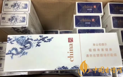 煙盒正面主圖為青花騰龍造型,張牙舞爪,欲入深海而攪起驚濤駭浪。煙盒頂端,印有青花瓷瓶的圖案,同時加以文字簡介。煙盒底端主色調(diào)為深藍(lán),與正反兩面的藍(lán)色青花龍色調(diào)相輔相成。China和瓷的品名,再次印制于此部位。H103,是指產(chǎn)品的隨機(jī)編號。