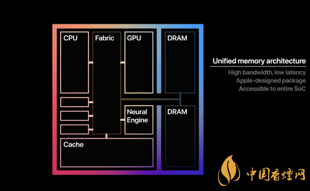 它與iPhone和iPad里面的蘋果芯片非常相似,只是功能更強(qiáng)大。它利用了蘋果公司的統(tǒng)一內(nèi)存架構(gòu)(UMA),這意味著全部內(nèi)存(DRAM)與需要訪問內(nèi)存的各種部件(比方說CPU、GPU、圖像處理器以及神經(jīng)引擎)都是在同一塊芯片上。其結(jié)果是,整塊芯片都可以訪問數(shù)據(jù),而不需要在不同部件之間復(fù)制數(shù)據(jù),也不需要進(jìn)行互連。對內(nèi)存的訪問有著極低的時(shí)延與極高的帶寬。其結(jié)果是更低功耗、更好性能。