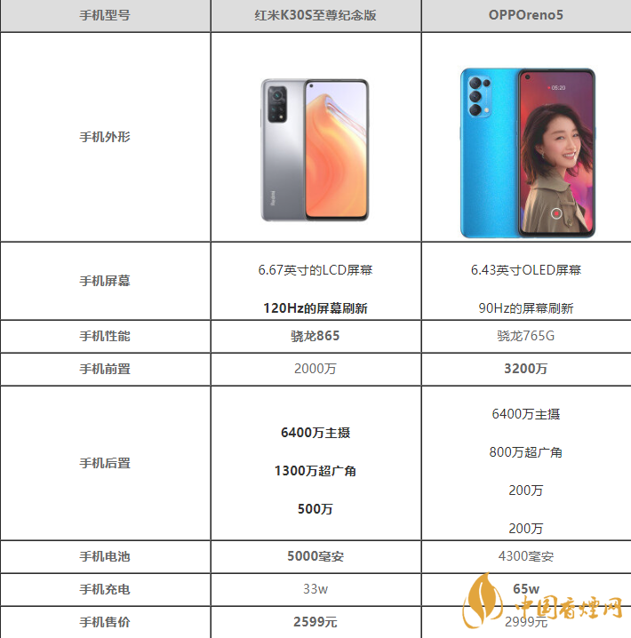紅米K30S至尊紀(jì)念版電池5000毫安,提供33w的閃充。OPPOreno5電池4300毫安,支持65w的充電速度