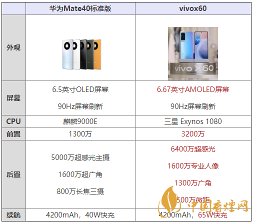華為Mate40標準版和vivox60哪款手機更好?華為Mate40標準版和vivox60兩款手機預計都將在本月末進行發(fā)售,那么這兩款手機哪款手機性能更好呢?哪款更值得入手呢?下面香煙網(wǎng)小編將對華為Mate40標準版和vivox60參數(shù)配置進行對比,一起來看看吧!