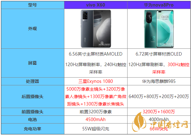 近期迎來vivoX60的發(fā)布,吸引大家目光的同時,華為nova8Pro也格外引人注目,vivoX60和華為nova8Pro那個好,下面香煙網(wǎng)小編將對vivoX60和華為nova8Pro參數(shù)對比進行介紹,感興趣的朋友一起來看看吧!