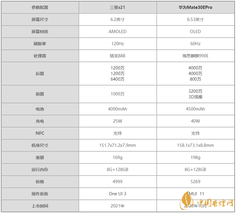 三星s21手機已經(jīng)正式發(fā)布啦,相信有不少小伙伴們都非常關(guān)注三星s21手機,那么三星s21和華為Mate30EPro有什么區(qū)別?哪款手機更好?下面香煙網(wǎng)小編為大家介紹一下關(guān)于三星s21和華為Mate30EPro的詳細對比,一起來看看吧!