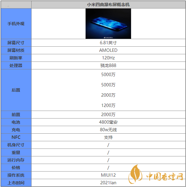 小米最近發(fā)布了一款小米四曲瀑布屏概念機(jī),那么小米四曲瀑布屏概念機(jī)怎么樣?這款手機(jī)的具體的參數(shù)是什么?接下來香煙網(wǎng)小編為大家?guī)硇∶姿那俨计粮拍顧C(jī)參數(shù)配置詳情,快來看看吧。