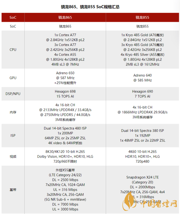 更為重大的升級之一應(yīng)該是支持LPDDR5內(nèi)存。驍龍865處理器集成了新的LPDDR5和LPDDR4X內(nèi)存控制器,LPDDR5內(nèi)存能夠帶來更高的內(nèi)存速度以及更高的帶寬,以及功耗也會得到相應(yīng)的提升。但是新的內(nèi)存的延遲應(yīng)該是一樣的。驍龍865處理器以及驍龍855處理器的技術(shù)規(guī)格如下表: