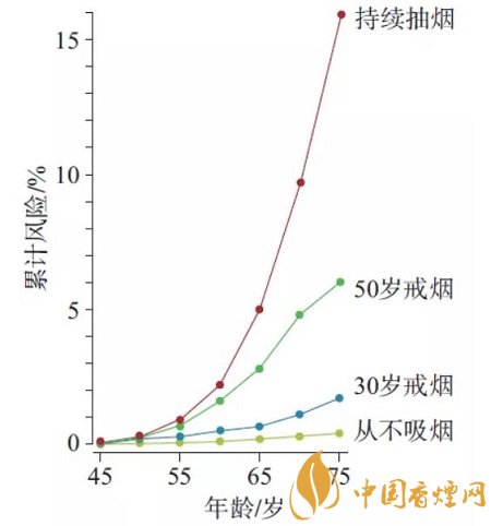 2004 年,著名的《英國(guó)癌癥雜志》 發(fā)表了經(jīng)典論文,詳細(xì)統(tǒng)計(jì)了英國(guó)等歐洲國(guó)家不同群體男性的肺癌死亡率。從圖上不難看出,75歲吸煙人群死于肺癌的概率是16%,比不吸煙人群高了將近50倍。換算一下,也就是說6個(gè)吸煙的人里面會(huì)有1位75歲之前就死于肺癌。更可怕的是,如果每天吸煙量超過5支,那么4個(gè)人里,就會(huì)有1位死于肺癌。