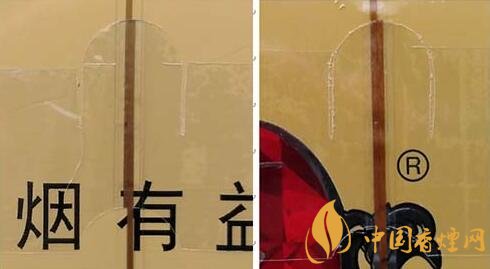 2.注冊商標圖案。真品卷煙采用起凸工藝商標印刷,圖案細節(jié)起凸完美,眼觀、手摸凹凸感明顯。該款假冒卷煙商標印刷起凸工藝較差,部分細節(jié)未做起凸,手摸圖案平滑。(圖2左真右假)
