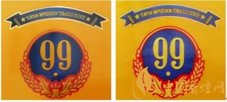 真品卷煙:1.商標(biāo)LOGO稻穗圖案凸起,整體立體、飽滿,大豐收。2.99數(shù)字筆畫圓潤(rùn)、飽滿,下面圓點(diǎn)尤為突出。3. 藍(lán)色底紋顏色重,邊緣向中間色彩過(guò)渡自然。4.商標(biāo)紙流水紋路清晰可見。