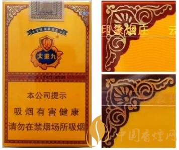 真品卷煙:1.“盾牌”圖案呈現(xiàn)凸起,手摸凹凸明顯,數(shù)字“9”筆畫中間凸邊緣凹。2.花團(tuán)圖案整體高于商標(biāo)紙面,細(xì)節(jié)處凹凸感強(qiáng)。3.“大重九”字體筆畫呈現(xiàn)中間凸邊緣凹,立體感強(qiáng)。4.藍(lán)色底紋顏色重,邊緣向中間色彩過(guò)渡自然。