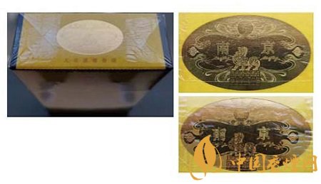 假冒卷煙:該款假冒卷煙南京字體邊緣金色輪廓線和筆畫內(nèi)無小圓點,字體筆畫顏色暗淡,燙金套印有偏差。(上真下假)