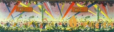 而貴陽煙草公司出品于上世紀50年代的“祖國”煙標(圖4),主版采用明快色調(diào),描繪出了新中國成立后人民當家作主的喜悅之情:只見各族人民身著節(jié)日盛裝,在彩球飄飄、五顏六色的射燈光柱直射天空背景襯托下,聚集于天安門前的華表周圍,在撼天動地的鼓樂聲中載歌載舞,盡情地歡慶新中國的誕生。