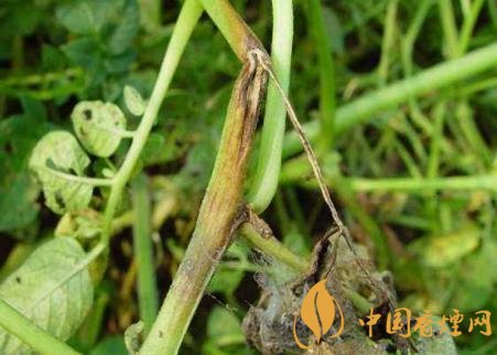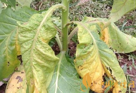 癥狀:煙草青枯病是維管束病害,典型癥狀為枯萎,病株多為一側(cè)枯萎,拔出后可見(jiàn)發(fā)病的一側(cè)支根變黑腐爛,未顯癥的一例根系大部分正常。葉片發(fā)?。撼跗谲浕瑁詾榍嗌?,故稱“青枯病”,隨著細(xì)菌充滿葉脈,兩天后葉脈變黑,葉內(nèi)為黃色網(wǎng)狀病斑。莖發(fā)?。撼霈F(xiàn)長(zhǎng)形黑色條斑,有的條斑擴(kuò)展到病株頂部或枯萎的葉柄上。到發(fā)病中后期,全部葉片萎蔫,條斑表皮變黑腐爛,病株莖和葉脈導(dǎo)管變黑,根部也變黑腐爛,甚至莖髓部呈蜂窩狀或全部腐爛形成空腔,僅留木質(zhì)部。橫剖病莖用力擠壓切口,從導(dǎo)管溢出黃白色菌膿。
