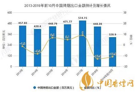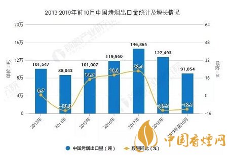2019年前10月中國烤煙出口量突破9萬噸。據(jù)中國海關(guān)總署數(shù)據(jù)顯示,2019年10月中國烤煙出口量為6128噸。累計方面,2019年1-10月中國烤煙出口量達到91054噸,同比下降12.1%。