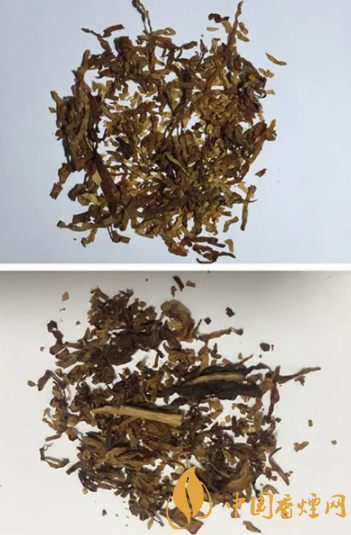 真品卷煙煙絲呈金黃色、絲條狀,煙絲結構為純葉絲,香氣醇厚;假煙煙絲呈棕黑色,含末量大,煙梗較多,香精氣味濃烈。