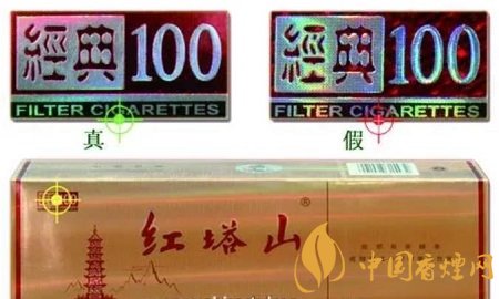 “紅塔山(硬經(jīng)典100)”是紅塔煙草(集團)有限責(zé)任公司出品的全國知名卷煙,深受廣大消費者的喜愛。為提高消費者和零售商戶對假冒卷煙的甄別能力,現(xiàn)將查繳的假冒“紅塔山(硬經(jīng)典100)”部分特征與真品卷煙相比較,對照圖片如下: