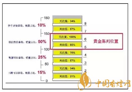 在同一組貨架上,因?yàn)轭櫩妥⒁暤姆绞讲煌?,所以不同陳列位置產(chǎn)生的銷量會有不同的變化,一般來說,與視線平齊的位置陳列的商品銷量最高,而顧客需要仰望和蹲下才能注視的商品銷量相對要低。