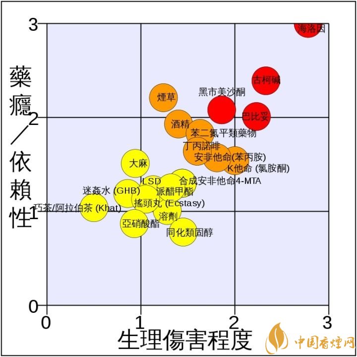 結尾分享一下剛看到的研究發(fā)現。20位從事依賴性治療的精神病醫(yī)師,在二十種常見管制藥品比較其傷害性(橫軸)及成癮性(縱軸),于2007年發(fā)表在權威醫(yī)學期刊《柳葉刀》,顯示煙草在成癮性排名第三,潛在危害程度排名第七,可見煙草的依賴性和傷害可能比某些傳統(tǒng)毒品還大。